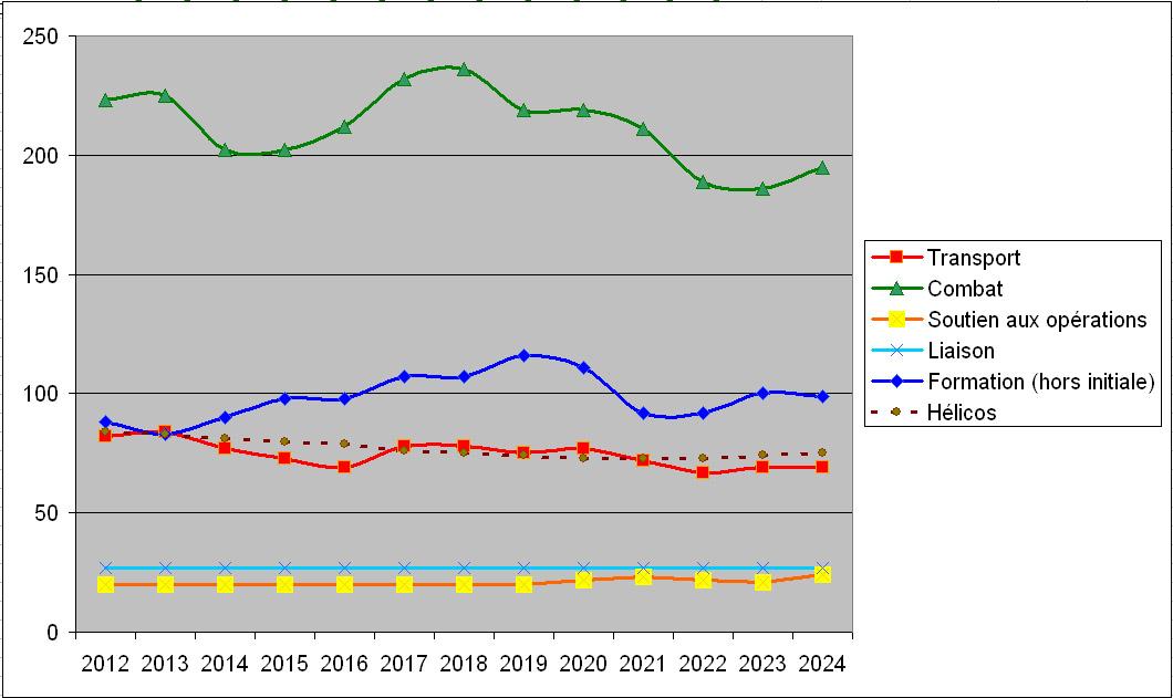 L’image générale est celle d’un parc qui a décru en nombre d’aéronefs de 528 à la mi-2011 à 499 en 2024 (y compris les drones, mais à l’exclusion de la flotte de formation initiale, actuellement les Cirrus, et des équipes de présentation).