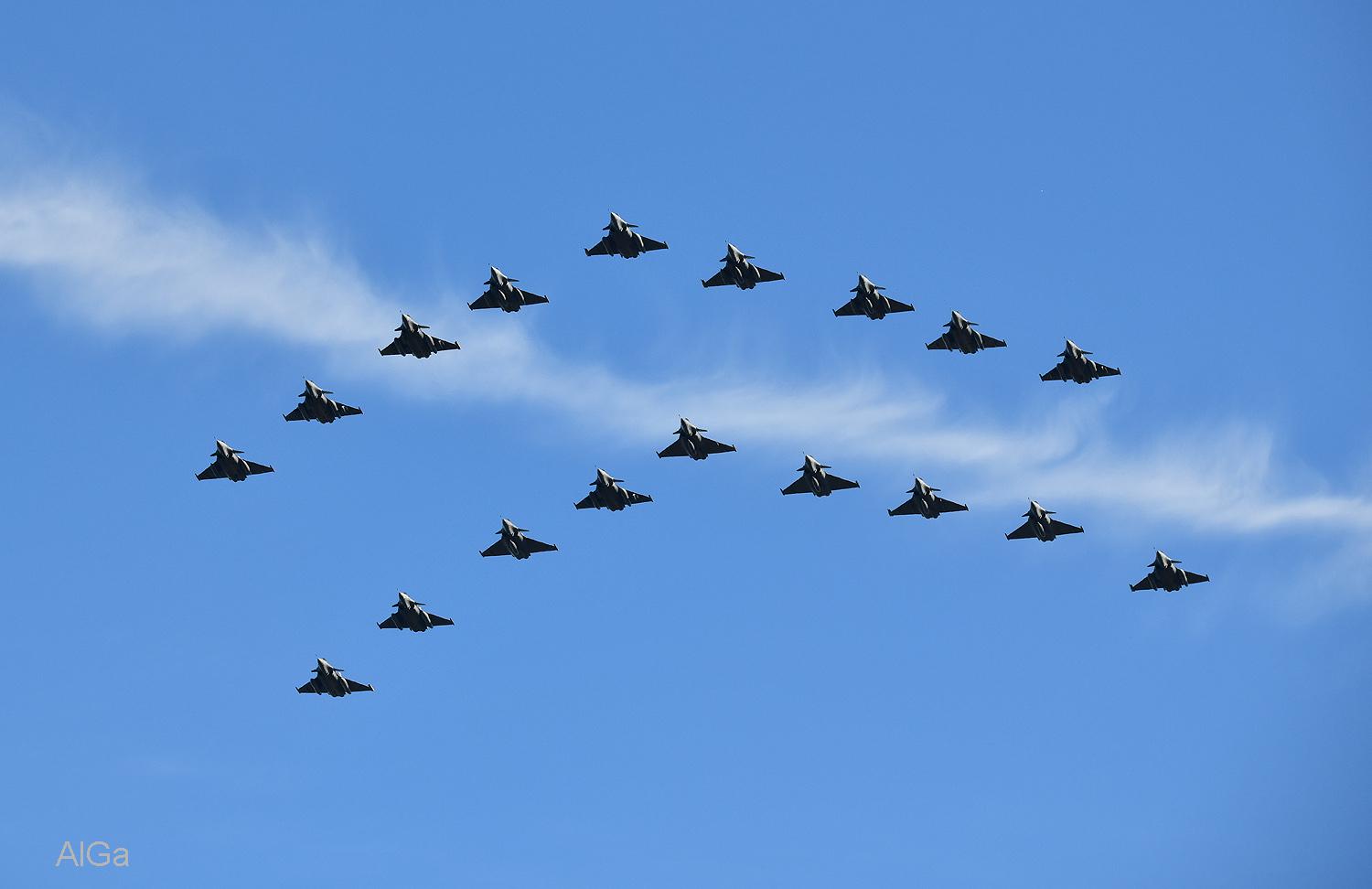 Et oui, le bruit de la formation de 18 Rafale s’était à peine estompé qu’une formation majestueuse de la SPA 154 faisait son apparition, en transit vers le nord. Au moins 22 volatiles, la preuve par la photo …