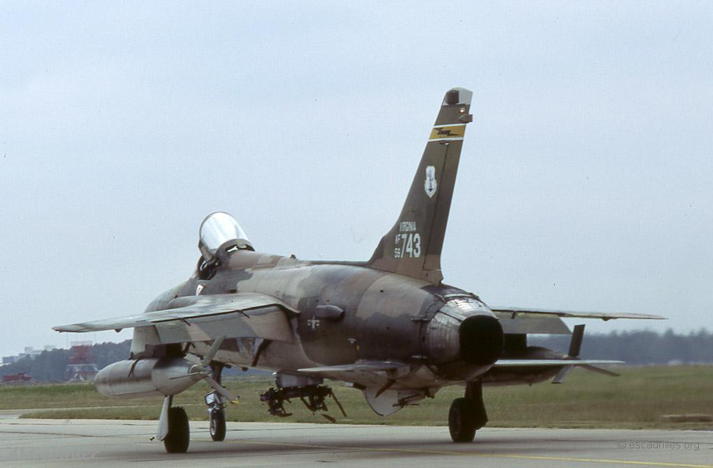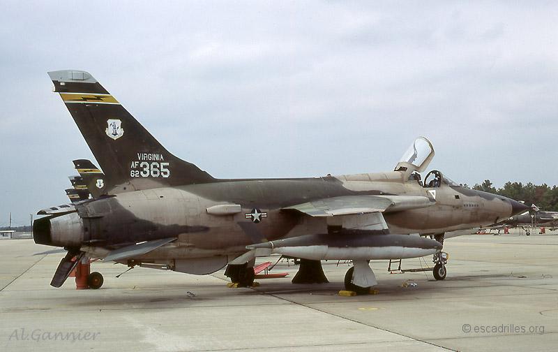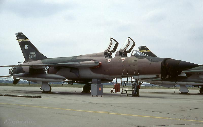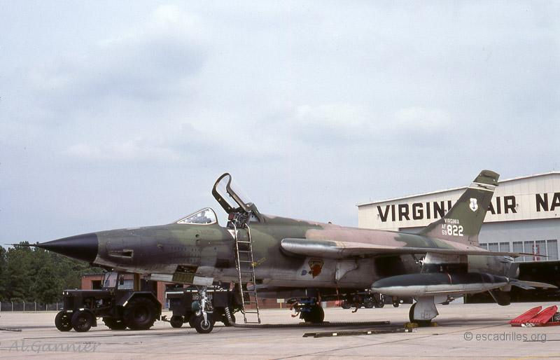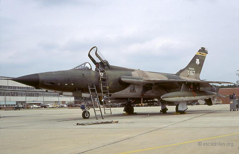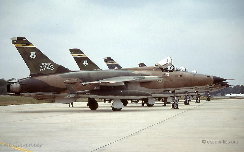 Les F-105D et F du 149th TFS de Byrd Field étant les derniers survivants de ces avions construits 20 ans plus tôt, ils avaient accumulé pour la plupart plus de 5000 heures de vol. Même s’ils posaient quelques problèmes de maintenance, surtout au niveau de l’électronique, ils permettaient aux pilotes de l’Air Guard de maintenir leurs compétences alors que la plupart des unités d’active volaient à cette époque sur les différentes versions de Phantom. Perpétuant des traditions acquises au Vietnam, les Thud de l’escadron portaient un ‘nose-art’ sous l’entrée d’air gauche. Un des Thunderchief de la Virginia ANG, le 61-0159, portaient encore l’étoile rouge symbolique des MiG-killer, suite à une victoire acquise par son pilote en 1967.