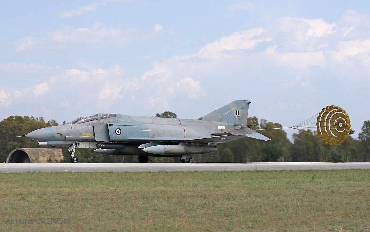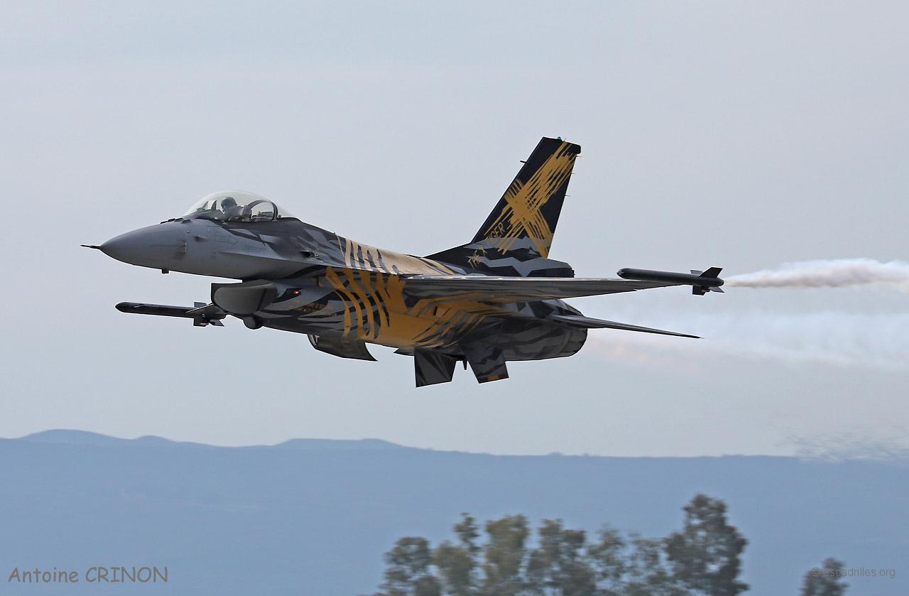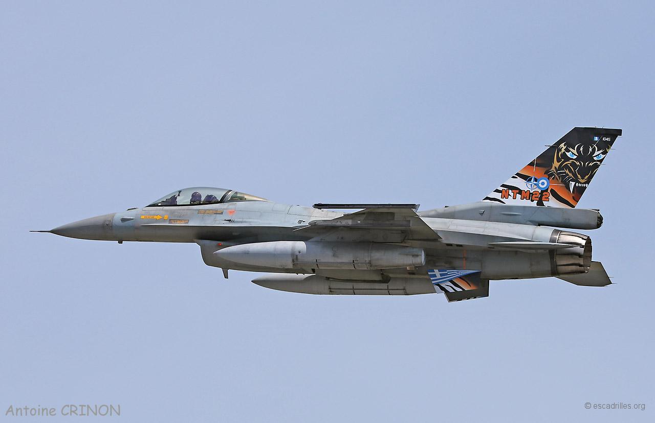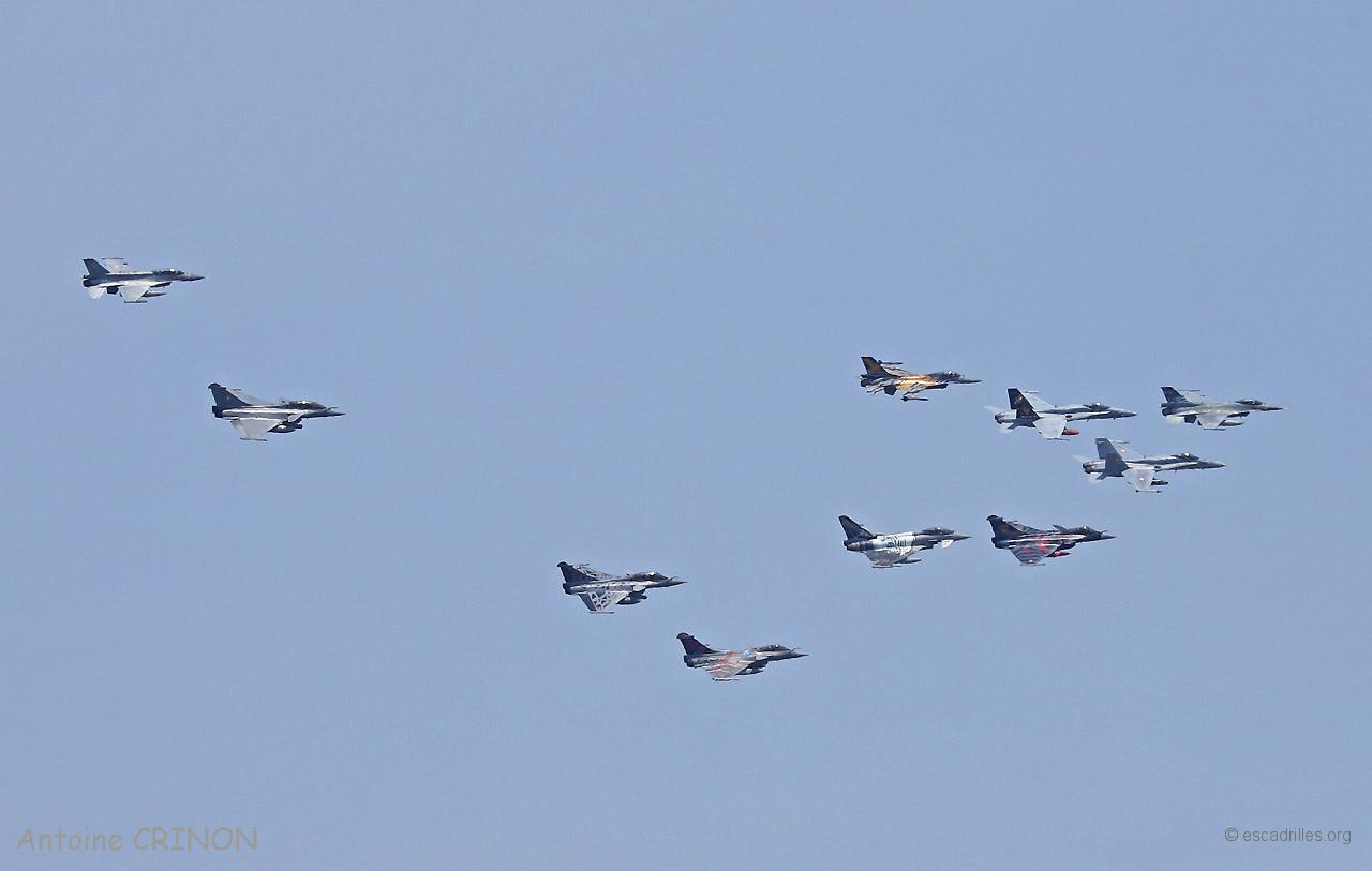 Le vol photo est parti à 14h15 avec tous les participants (un avion par nation), les photos ont été faites par un F-16 biplace grec et un Rafale B de la 30ème Escadre avec Katsuhiko Tokunaga en place arrière. A cette occasion, les Grecs ont sorti leur F-16 décoré (une dérive, n°1045) … la peinture était déjà écaillée au retour.