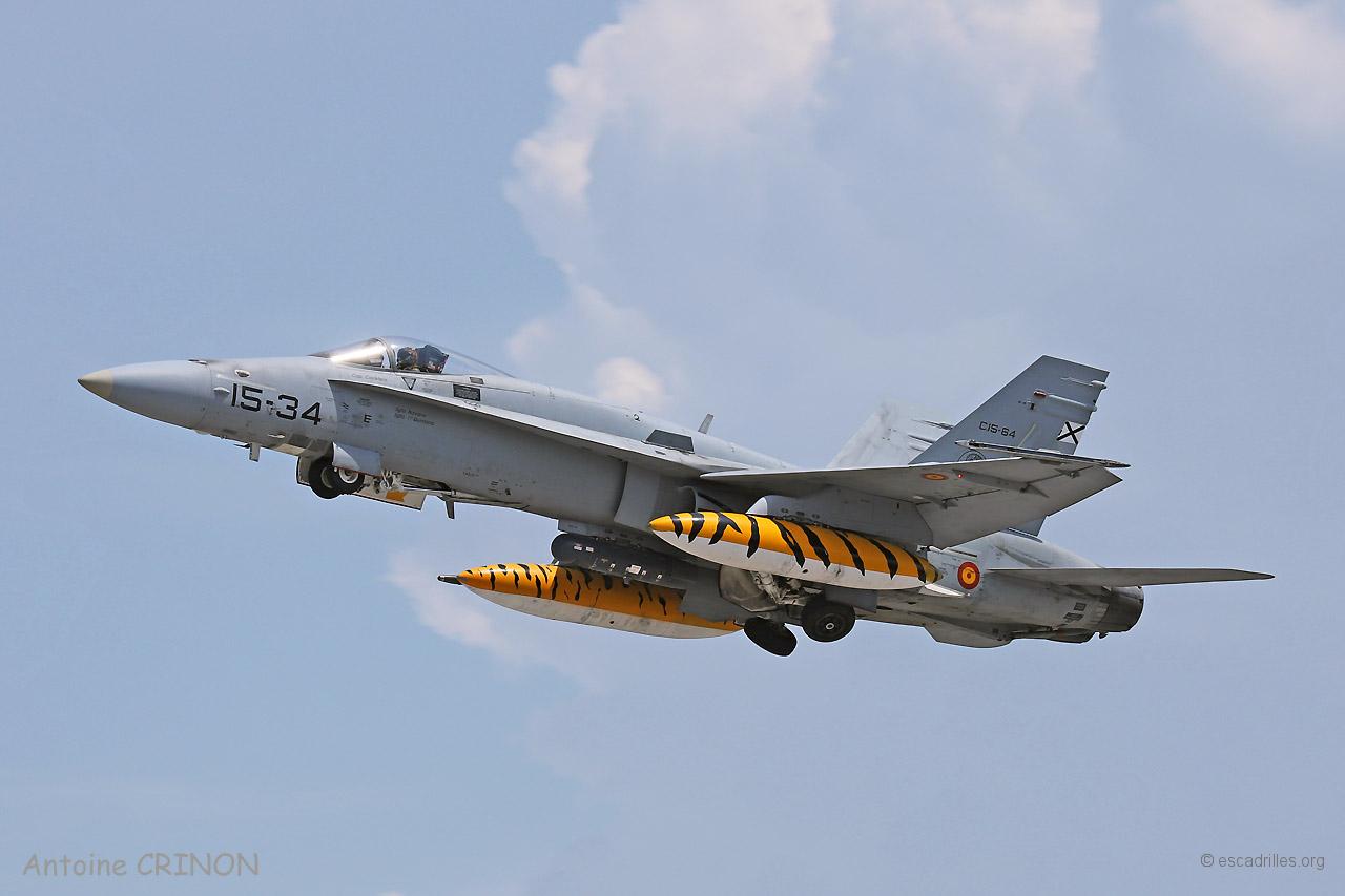 Le F-18 Solo Display espagnol a enchaîné sa démo (15-77), puis la deuxième vague (plus réduite que celle du matin, 19 aéronefs) est partie entre 14h50 et 15h05. Enfin, les marins ont réalisé leur démonstration (M2 en lisse et M44 en bidon ventral supersonique) ; le vol photo est passé juste après.